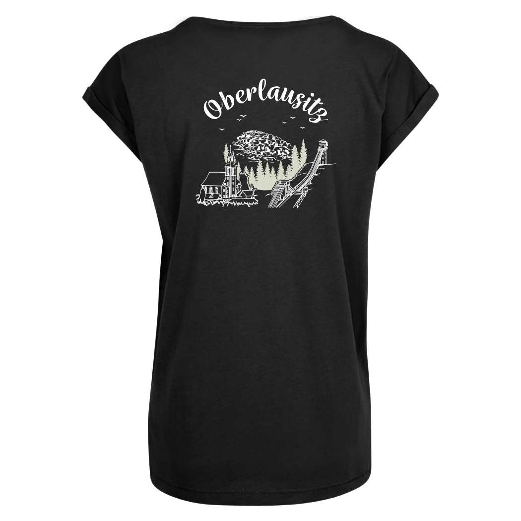 Hochwertiges Damen T-Shirt, beidseitig bedruckt. Spitzcunnersdorf/Leutersdorf Edition. Hinten mit großem Druck mit „Oberlausitz“ Schiftzug und Goethekopf, Spitzcunnersdorfer Kirche und Forstenschanze als Illustrationen. Vorne mit einem kleinen Oberlausitz Druck mit der Silhouette vom Goethekopf und Wald.